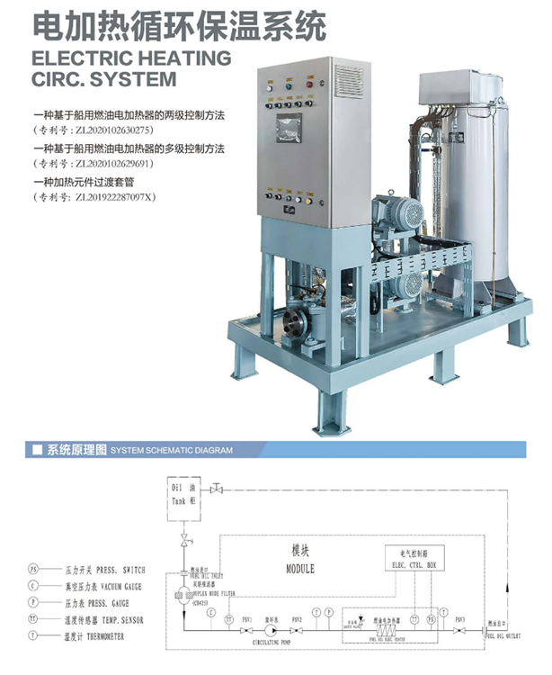 电加热循环保温系统节能原理,在船舶长时间停泊期间,利用电加热循环系统给燃油柜和缸套水系统保温,省去了传统锅炉点火蒸汽保温的燃油消耗。